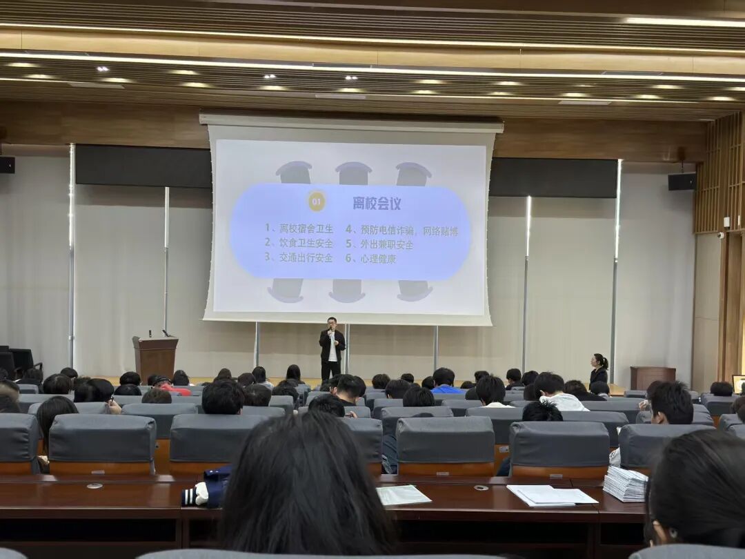 会上,李林霞辅导员首先明确了离校前的各项注意事项:从宿舍卫生的收尾整理,到饮食、交通出行的日常防护,细致叮嘱学生做好离校前的收尾工作;强亮亮老师重点强调了实习期间的安全要点,围绕外出兼职的风险规避、电信诈骗与网络赌博的识别防范等安全问题,结合真实案例拆解常见陷阱,引导学生提高警惕。此外,辅导员提醒学生在实习过程中需注意的职场安全细节,比如与实习单位规范签订协议、工作场景中的个人防护等,帮助学生提前熟悉实习场景下的安全准则。