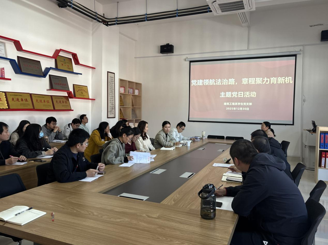 为深入学习贯彻习近平法治思想,弘扬宪法精神,增强支部党员的法治意识与使命担当,2025年12月30日,建筑工程系学生党支部在建筑楼401党员活动室组织开展“党建领航法治路,章程聚力育新机”主题党日活动。本次活动紧密结合2025年国家宪法日主题,通过专题学习、交流研讨等形式,引导师生党员将法治精神内化于心、外化于行。党支部书记李林霞主持。
