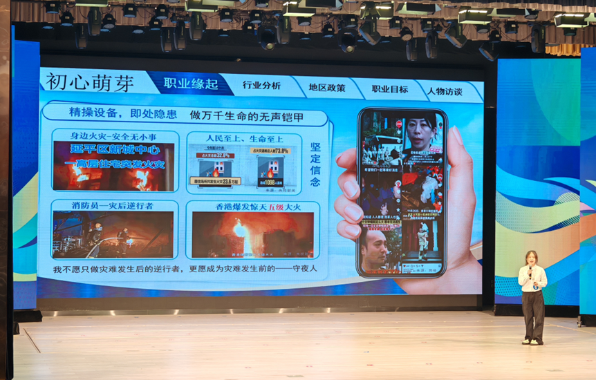 比赛中,选手们围绕职业目标定位、行业认知、能力提升路径等核心内容,依次完成主题陈述与答辩,展现出扎实的专业素养和清晰的职业发展思路。评委团严格参照国赛标准,从目标契合度、岗位胜任力、发展潜力等维度进行综合评审。