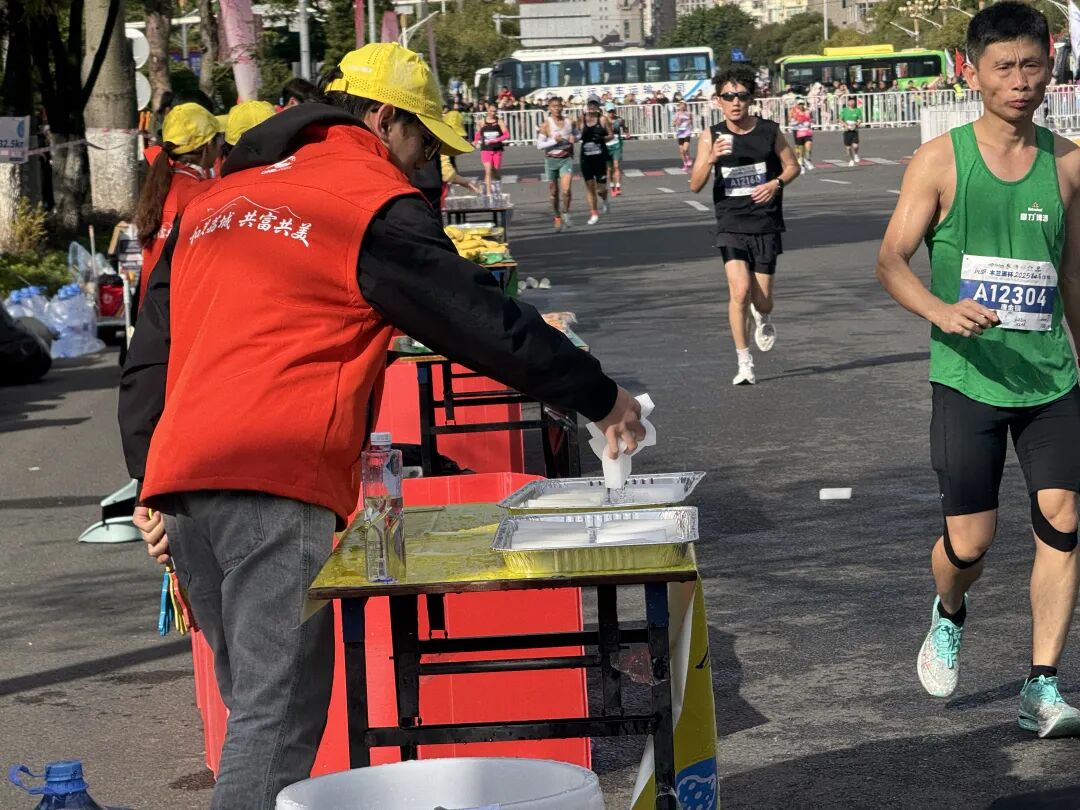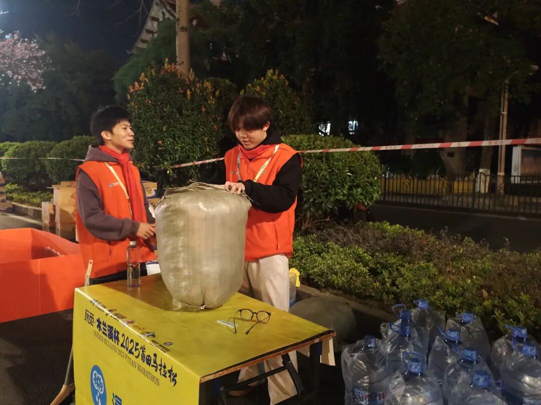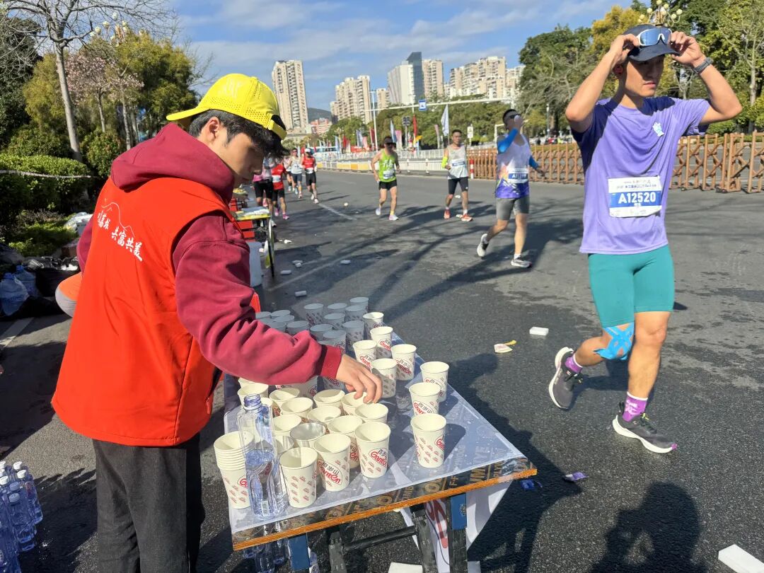 在补给服务中,学子们动作麻利、笑容温暖,及时为路过的选手递上水和补给品,耐心解答选手的疑问,用细致周到的服务赢得了选手与现场工作人员的一致好评。奔跑的身影与热情的志愿红相映成趣,成为木兰溪畔一道靓丽的风景线。
