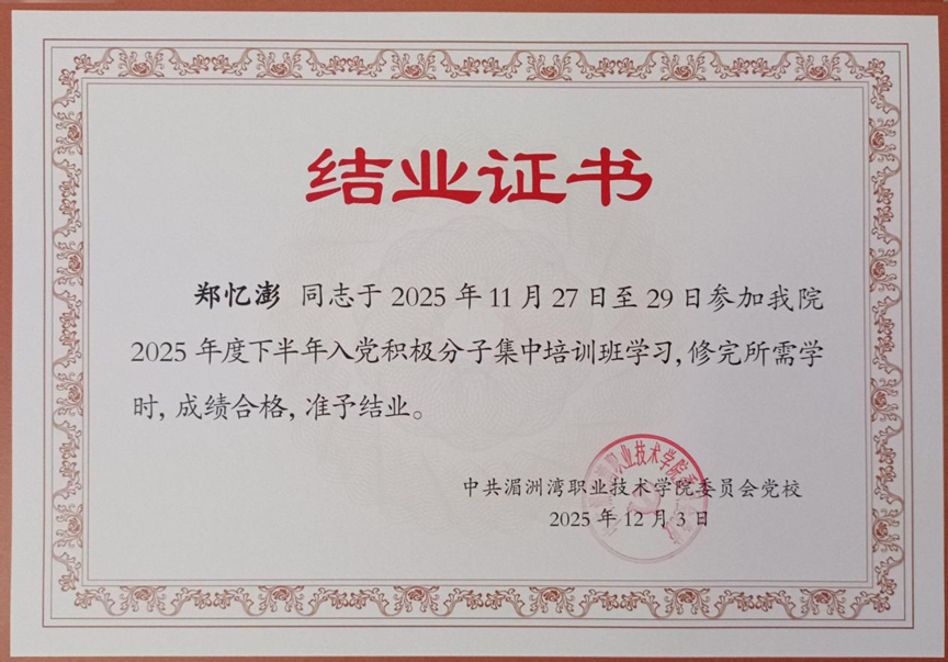 步履不停,奋斗不止。大一入学便立下远大志向,学习态度端正,努力提升自己的专业知识。郑忆澎同学始终以高度的热情和严谨的态度投入到理论知识的学习中,荣获学年班级、专业智育分和综测成绩第一名。还积极投身各类专业技能比赛,将其视为专业学习的“第二课堂”,提升专业能力和创新能力。2025年6月,获得福建省先进成图一等奖、2025年5月福建省生产事故应急救援优秀奖,创新创业坡安哨兵湄洲湾职业技术学院银奖等多个奖项,累计获得省级奖状2张、校级奖状8余张。同时,积极提升专业技能,考取相关证书,如全国计算机等级考试二级办公软件高级应用与设计证书等。