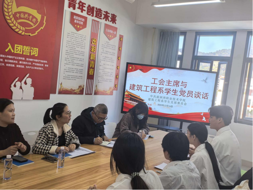 2025年12月16日,在建筑楼南409,工会主席李涛与建筑工程系学生党员代表开展专题谈话,以实...
