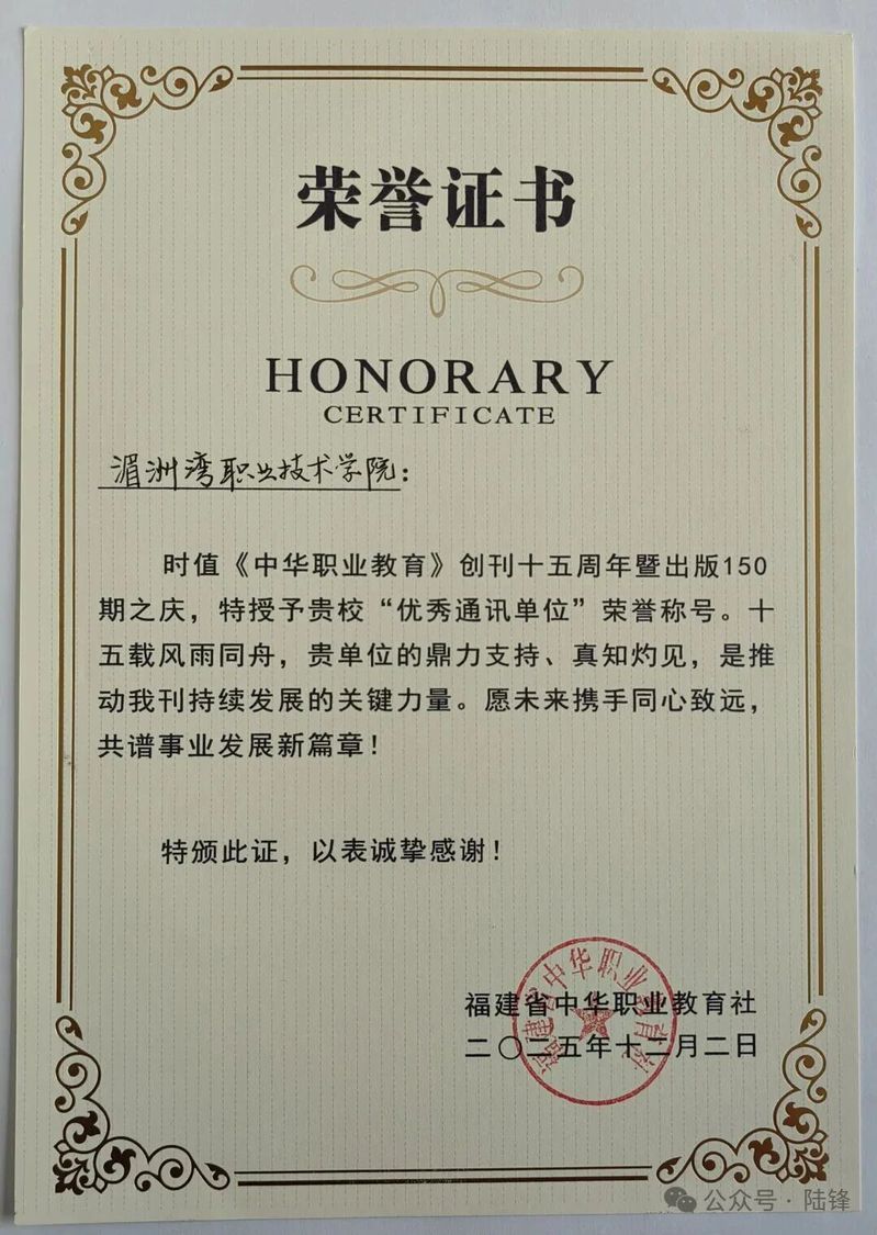 另悉,12月初,福建省中华职业教育社授予湄洲湾职业技术学院为“优秀通讯单位”荣誉称号,授予学院建筑工程系党总支副书记陈各辉为优秀通讯员荣誉称号。